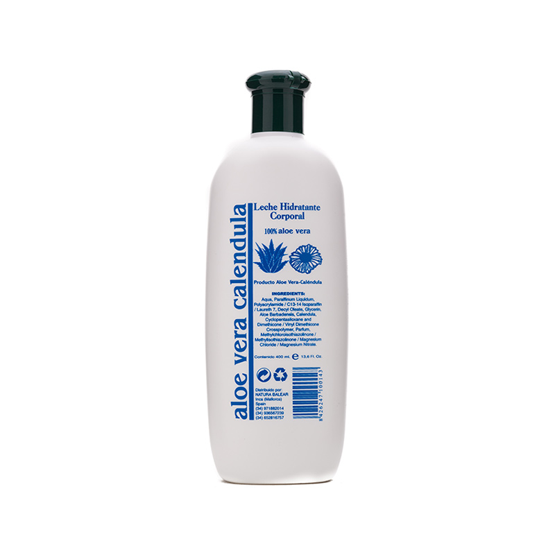 LECHE HIDRATANTE CORPORAL DE ALOE Y CALÉNDULA. Es una emulsión corporal que ante todo otorga hidratación y tersura a la piel de toda la familia. La unión complementaria del Aloe Vera y la Caléndula incrementan las óptimas cualidades de esta emulsión No grasa. Hipoalergénica. Producto cosmético de uso externo no testado en animales. Presentación envase de 400 ml.
